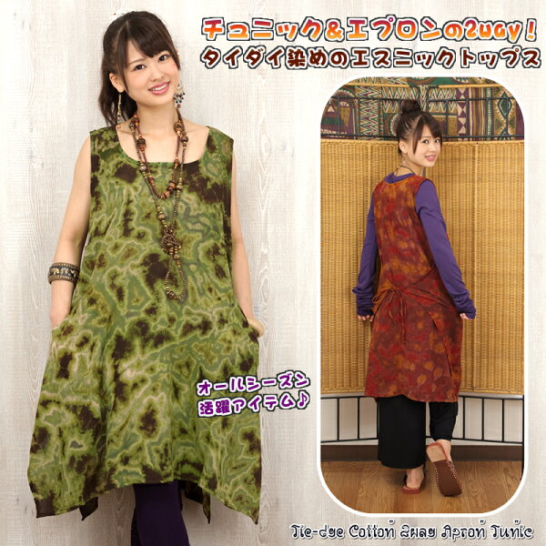 アイテムインフォ 全面に入った手染めのシックなタイダイ模様がエスニックテイストなエプロンチュニックです。