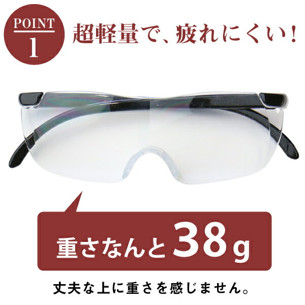 ● 商品情報 小さいものが見えづらい… そんな悩みを抱えている方におススメ! 朝の新聞や読書、小さい文字を見るのには 両手が使えるグラスルーペがおススメ! 老眼鏡、眼鏡、コンタクトレンズの上からでも掛けられるからとっても便利! 拡大率1.6倍は驚きの見やすさを実感いただけます! また、重量はわずか38g!丈夫な上に重さを感じません。